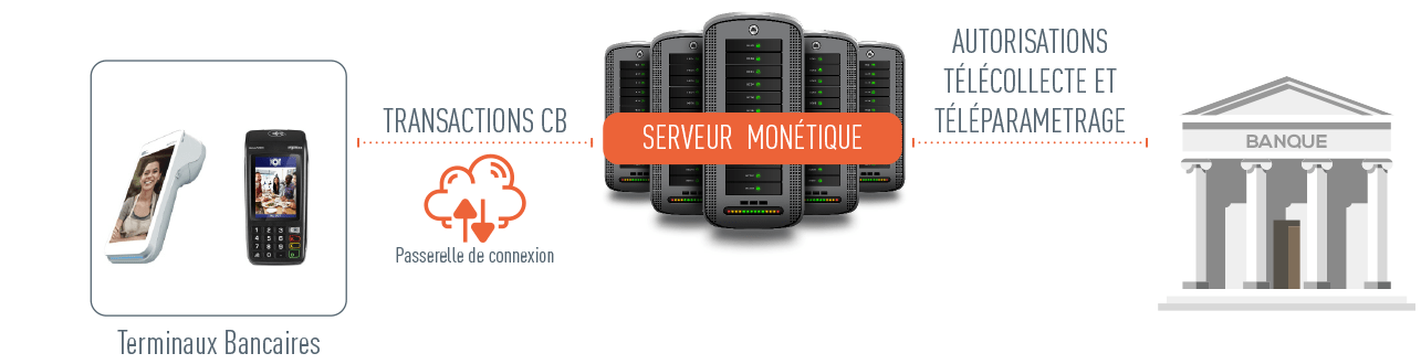 Le serveur communique ensuite avec les banques pour transmettre les transactions, ce n’est plus le terminal de paiement qui fait le lien avec les banques. Les différentes opérations telles que les télécollectes, les demandes d’autorisation, … sont réalisées par le serveur central et non par le terminal de paiement.